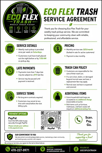 Why choose Eco Flex Trash for your waste needsAffordable weekly pickupFlexible service optionsLocal and customer-focusedConvenient Saturday pickup